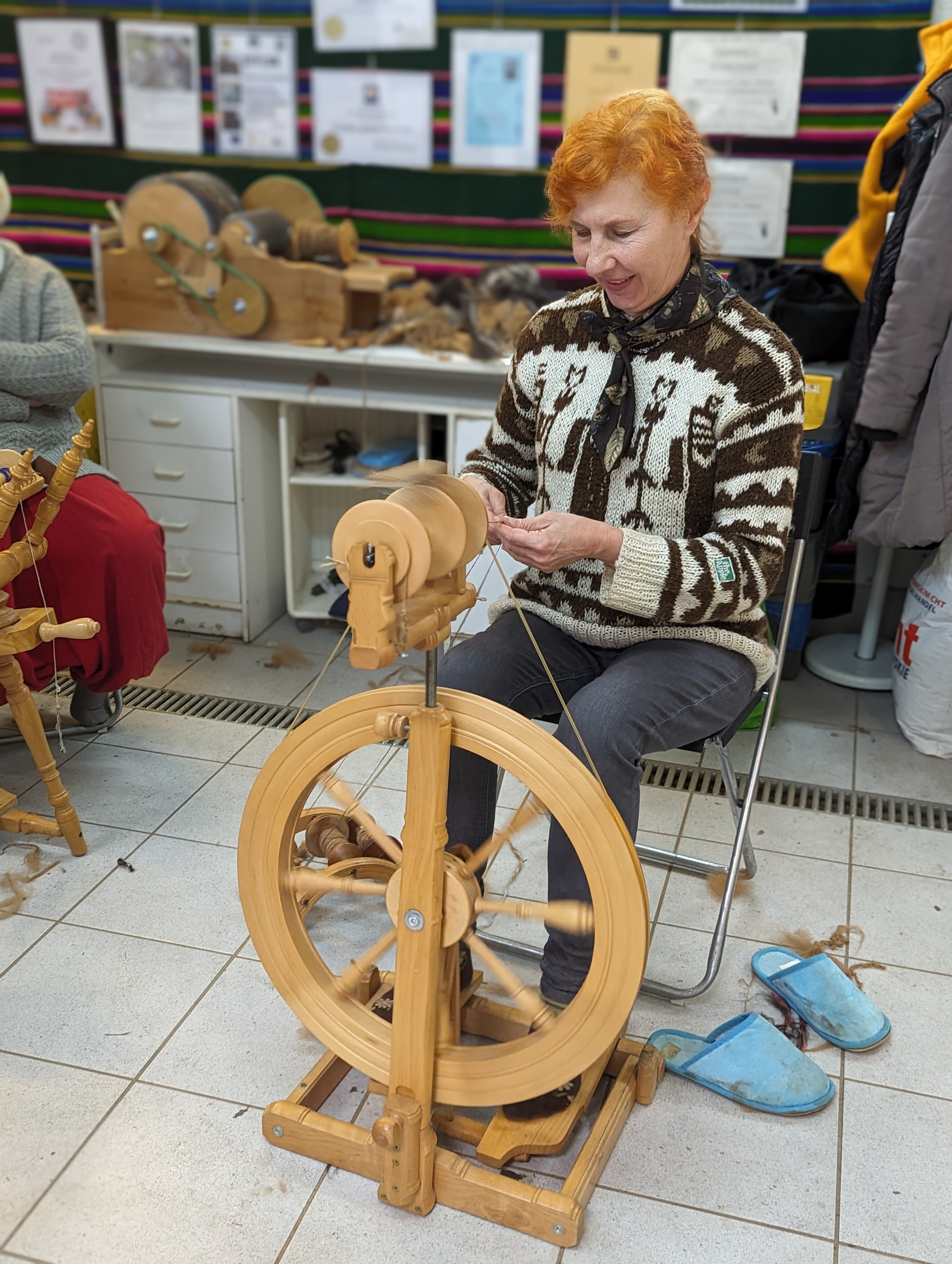Wełna z naszych alpak jest strzyżona elektryczną maszynką, ale na tym kończy się elektryka. Przędziemy wełnę na kołowrotku, z włóczki tworzymy wyroby na szydełku, drutach czy krośnie.