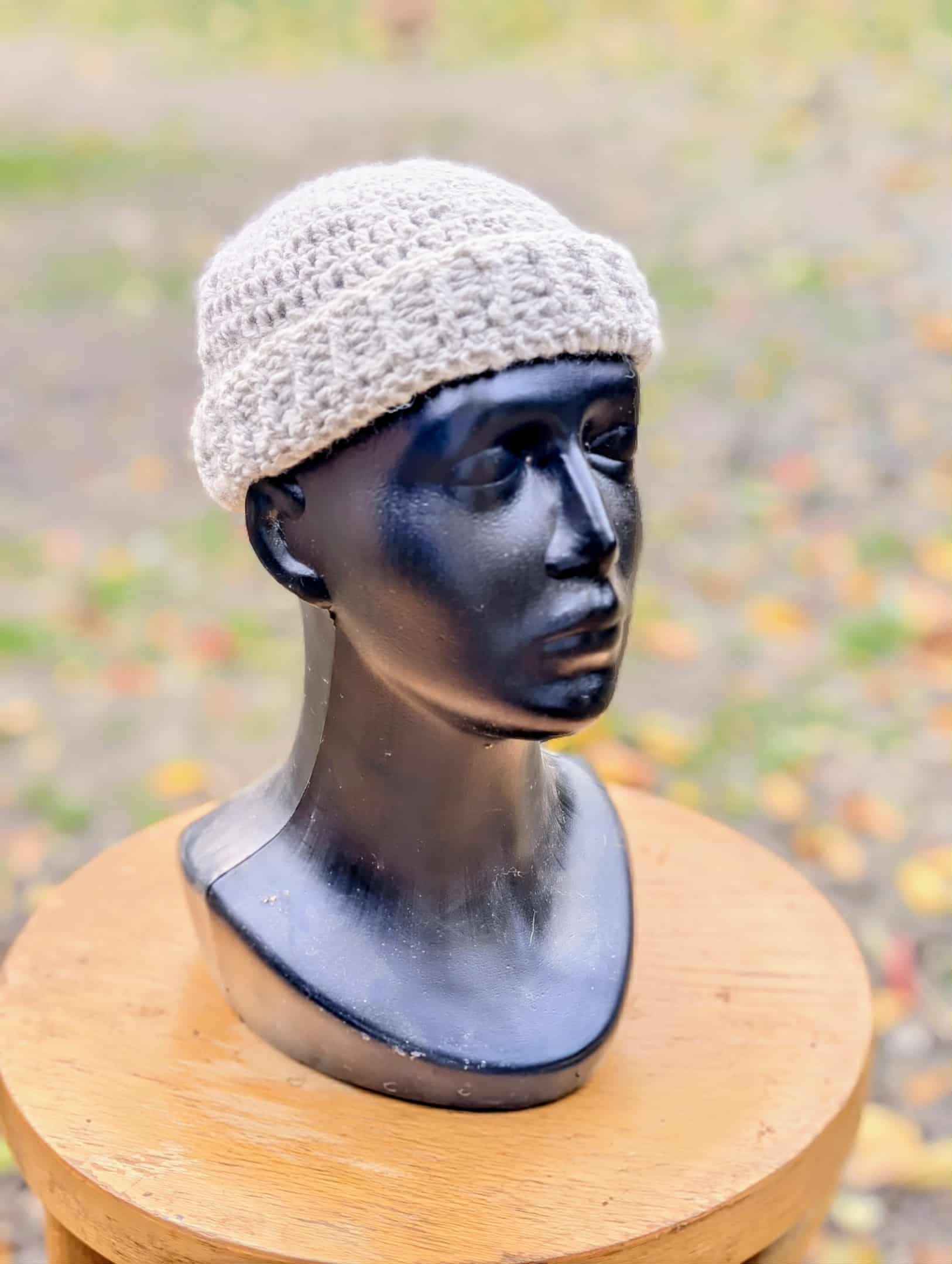 Biała czapka dokerka - krótka, nada się zarówno na jesień jak i na wczesną zimę.