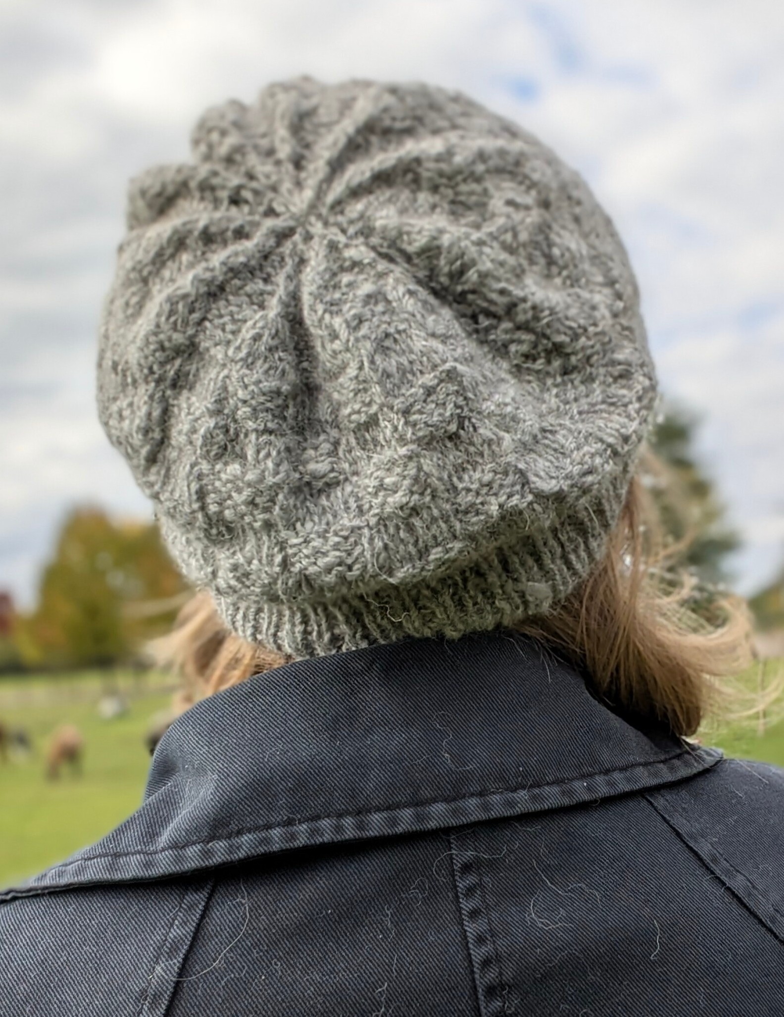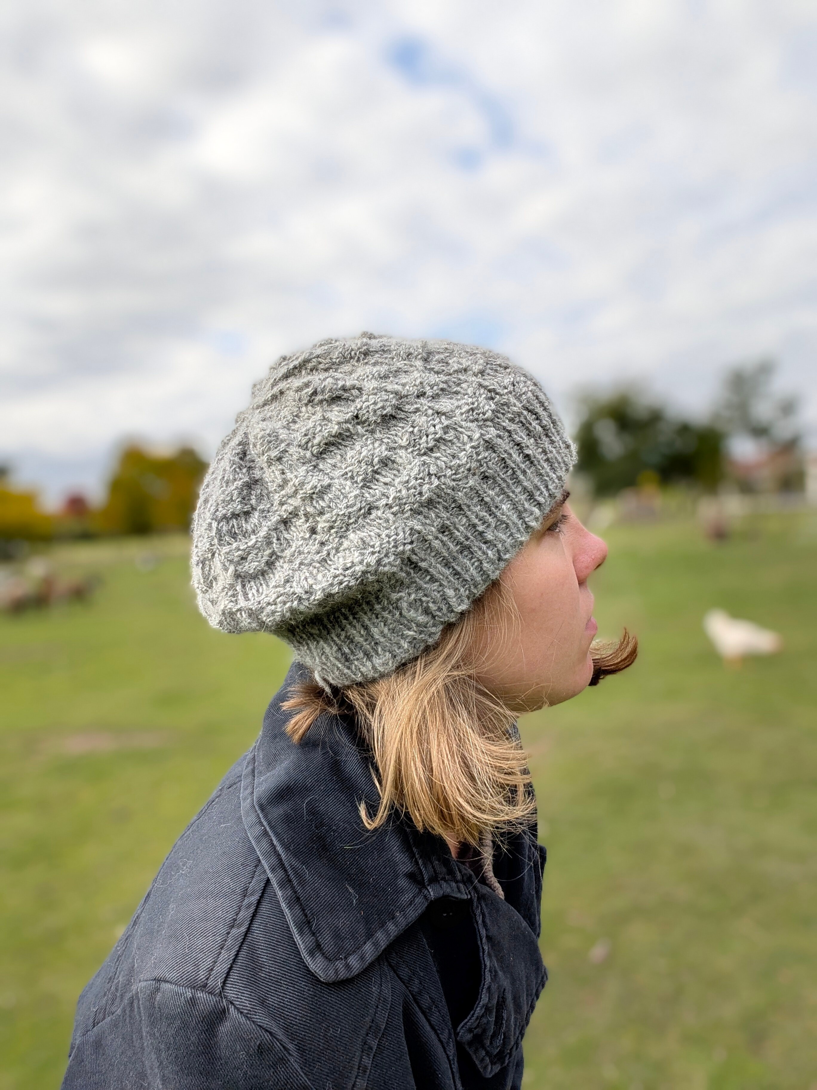 Szara czapka z delikatnym wzorem szachownicy - lekka, nada się zarówno na jesień jak i wczesną zimę.