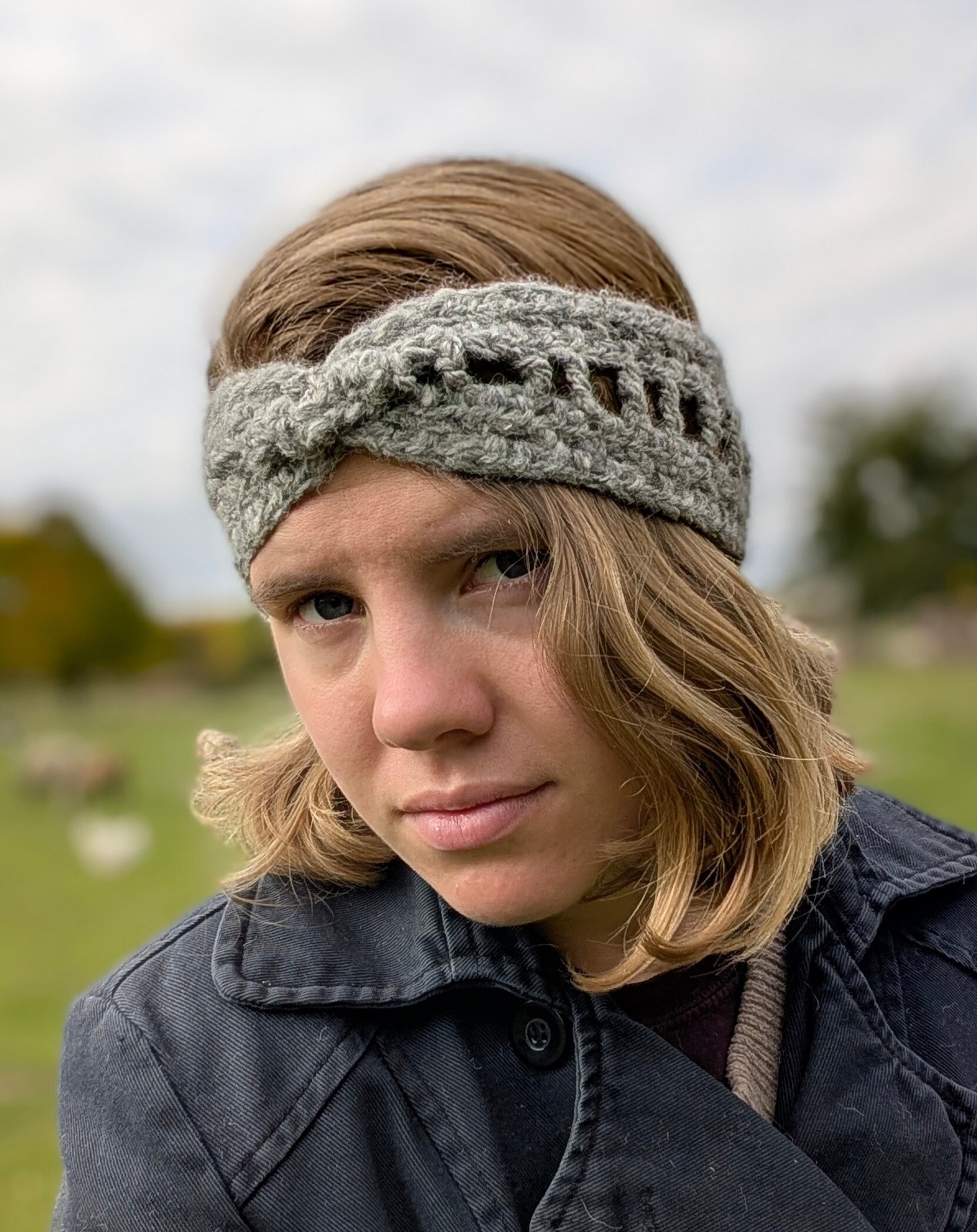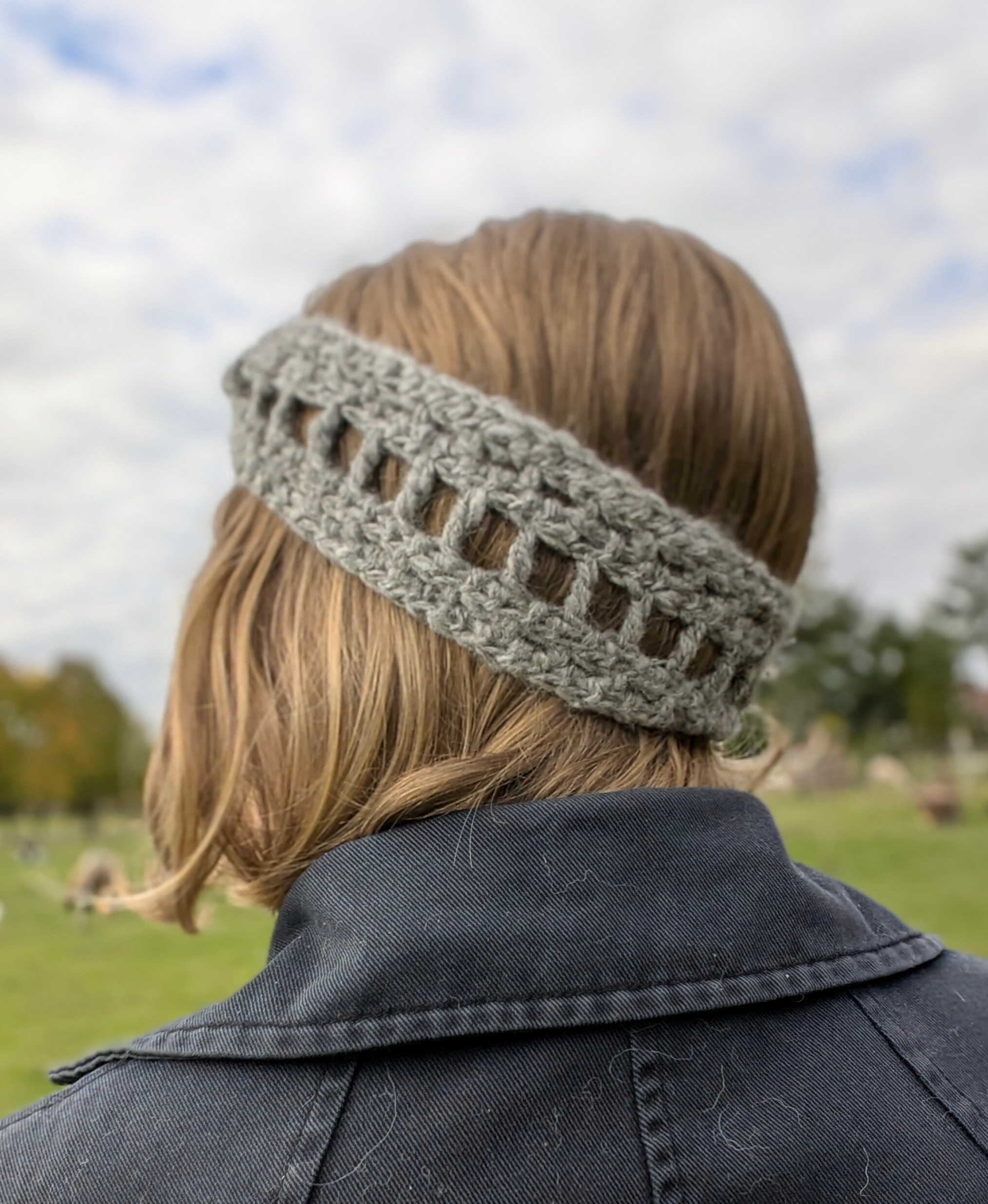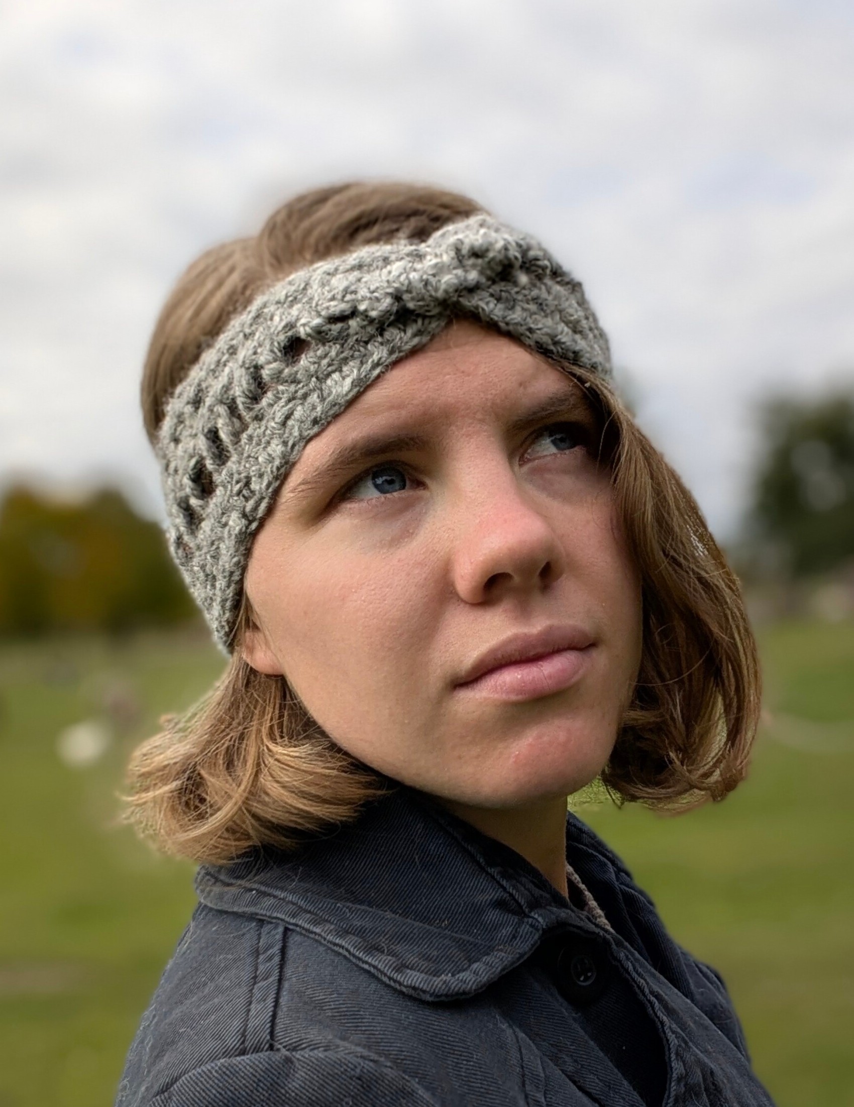 Szara lekka opaska o pięknym wzorze z zawinięciem z przodu - idealna na jesień jak i na wczesną zimę.