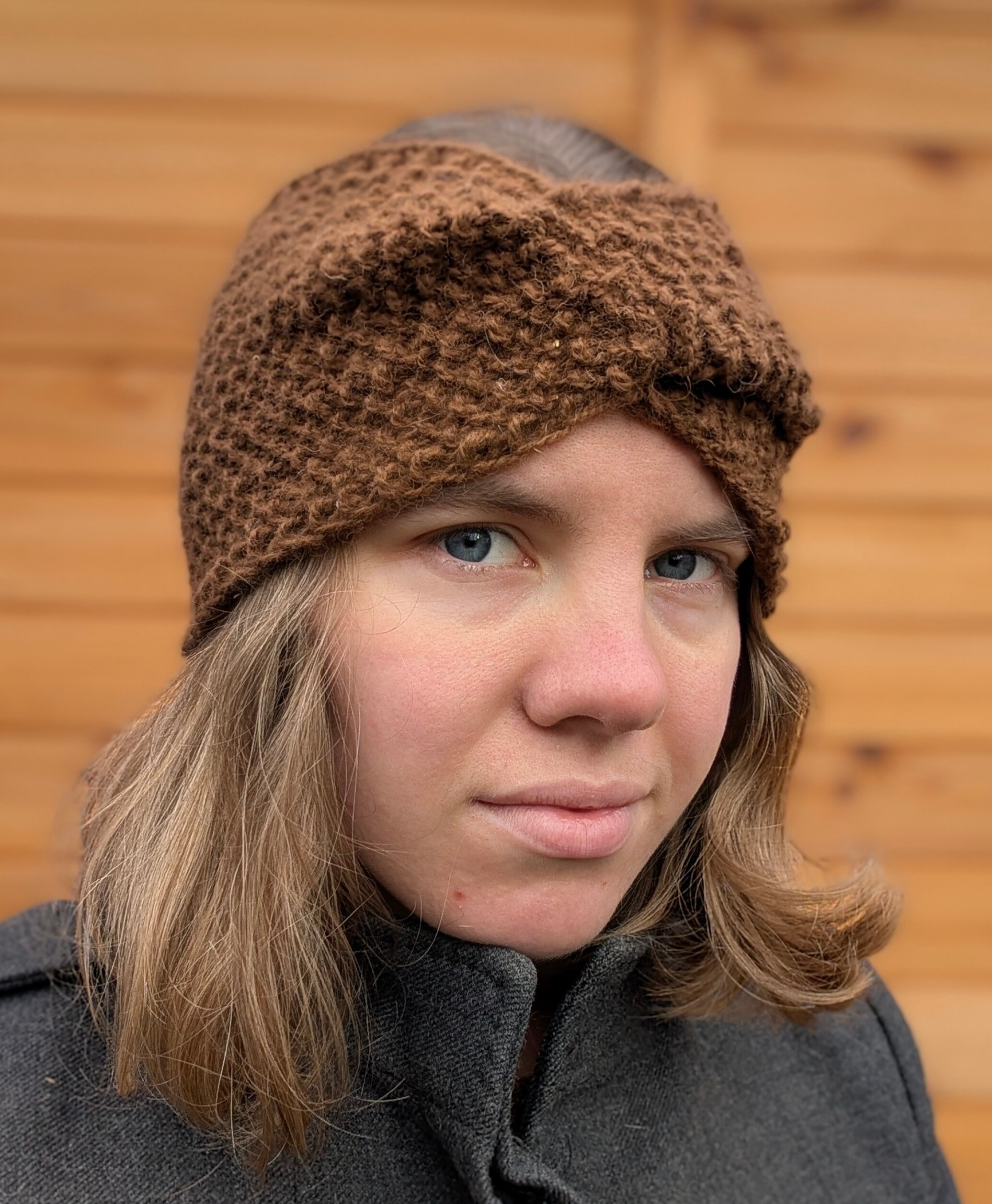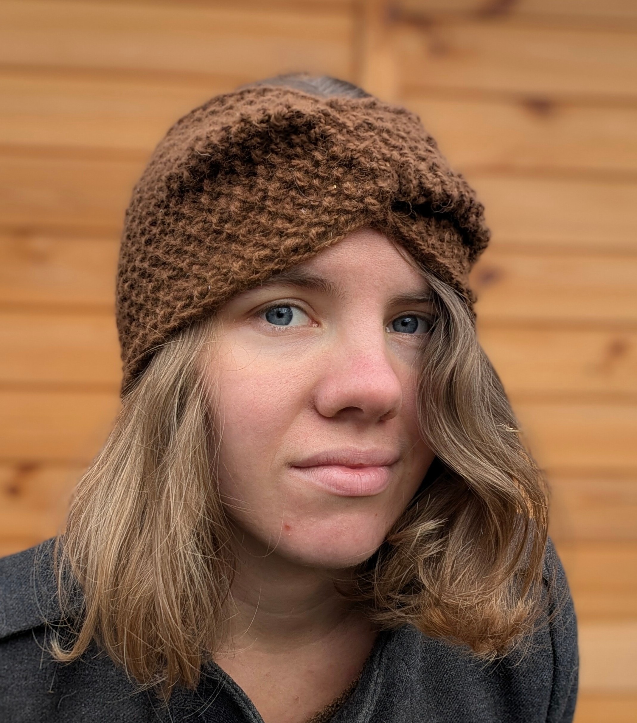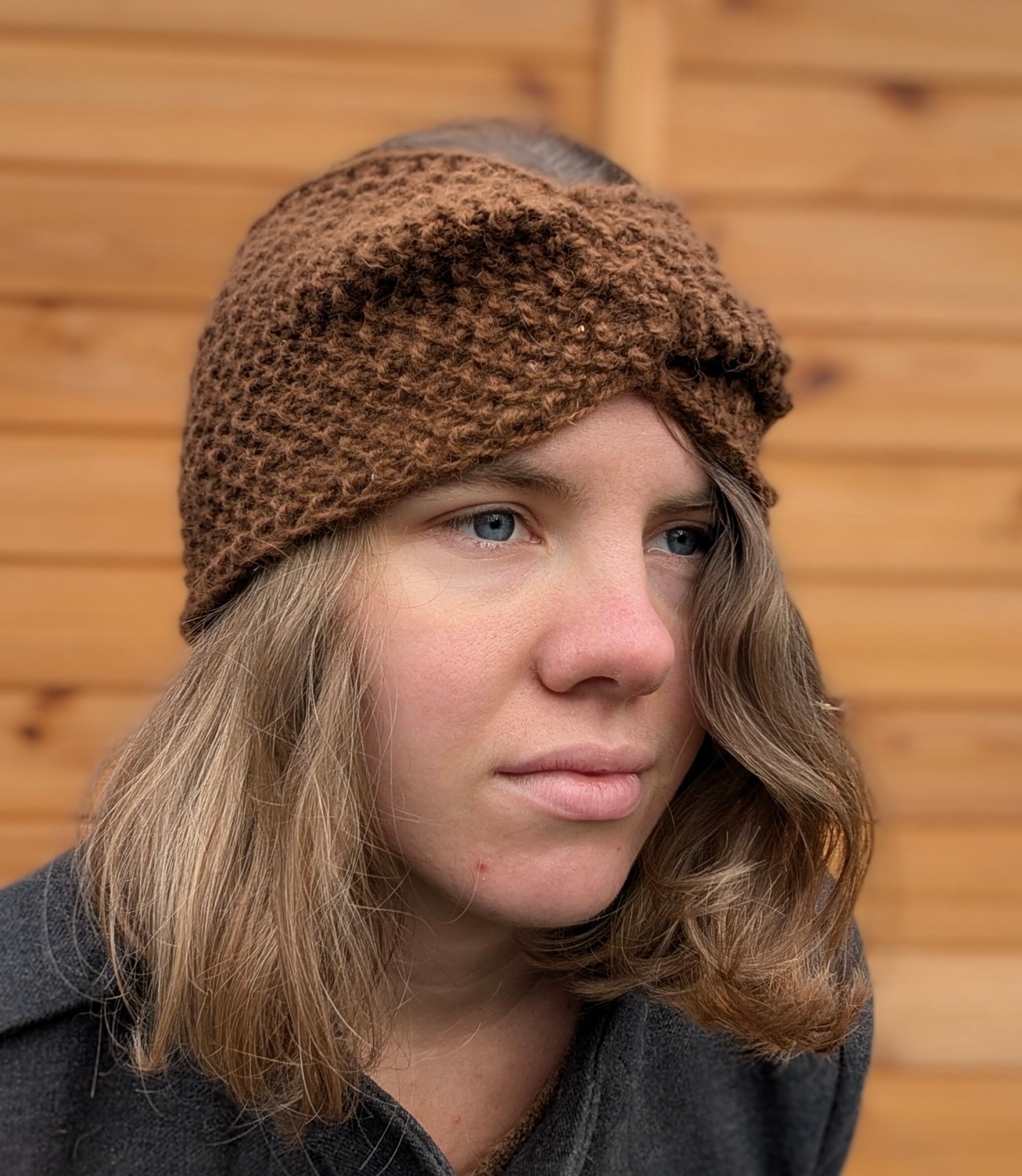 Brązowa opaska z zawinięciem z przodu - miękka i ciepła, nada się zarówno na jesień jak i na zimę.