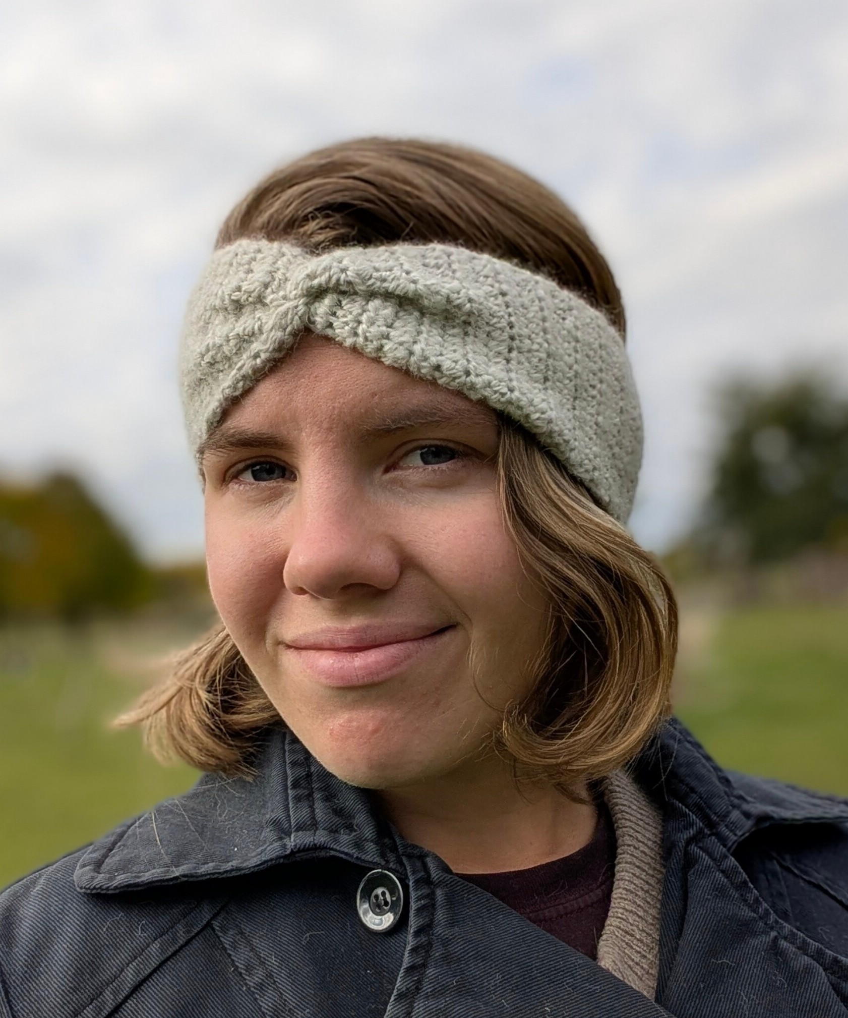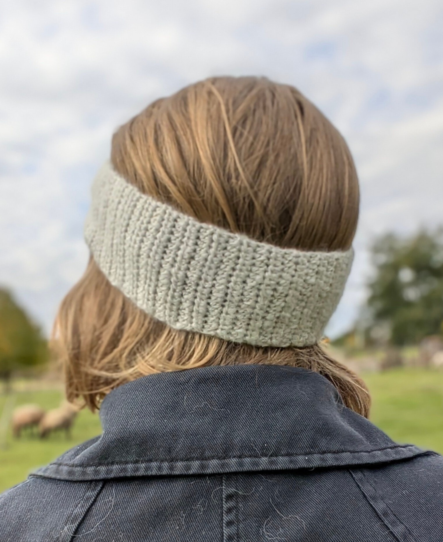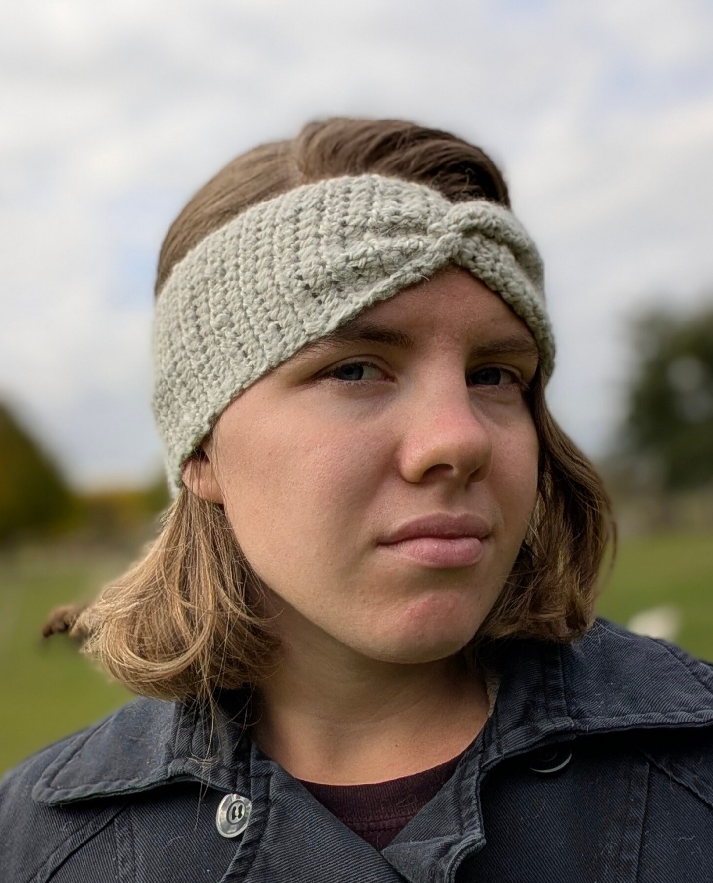 Biała opaska z zawinięciem z przodu -nada się zarówno na jesień jak i na zimę.