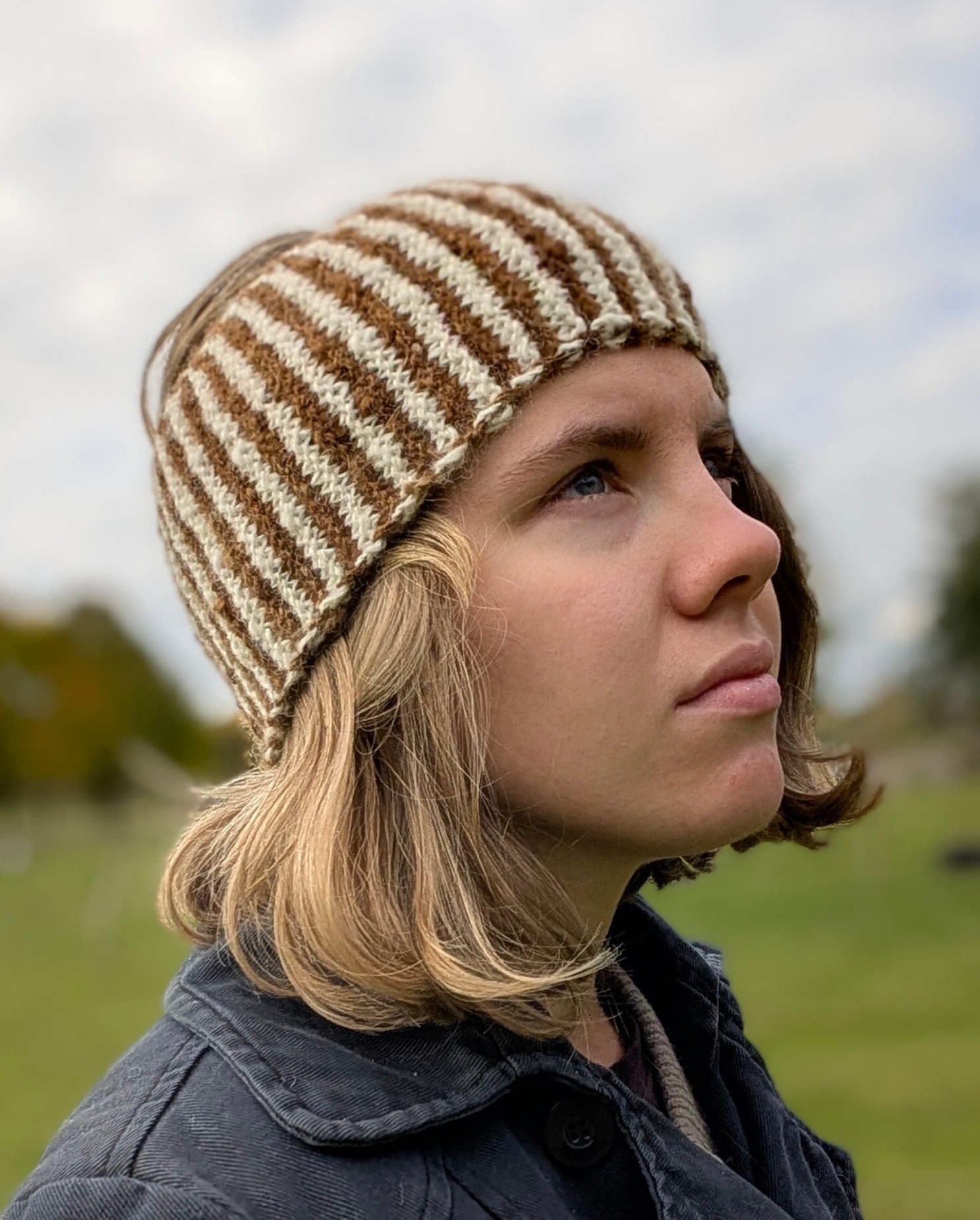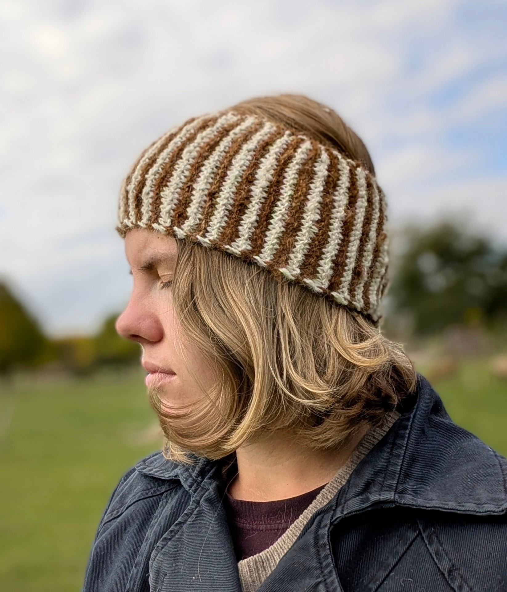 Biało-brązowa opaska w paski - nada się zarówno na jesień jak i na wczesną zimę.