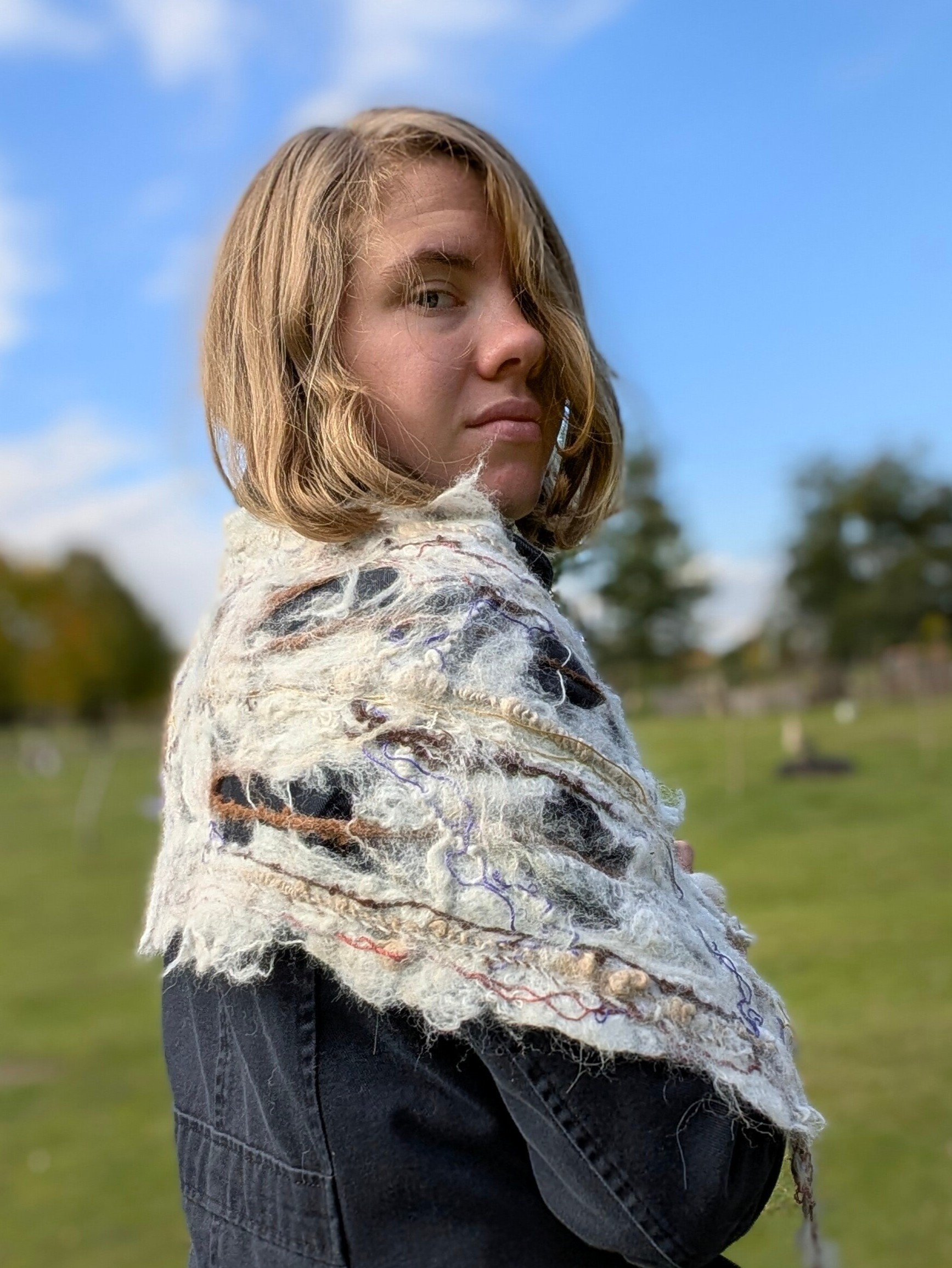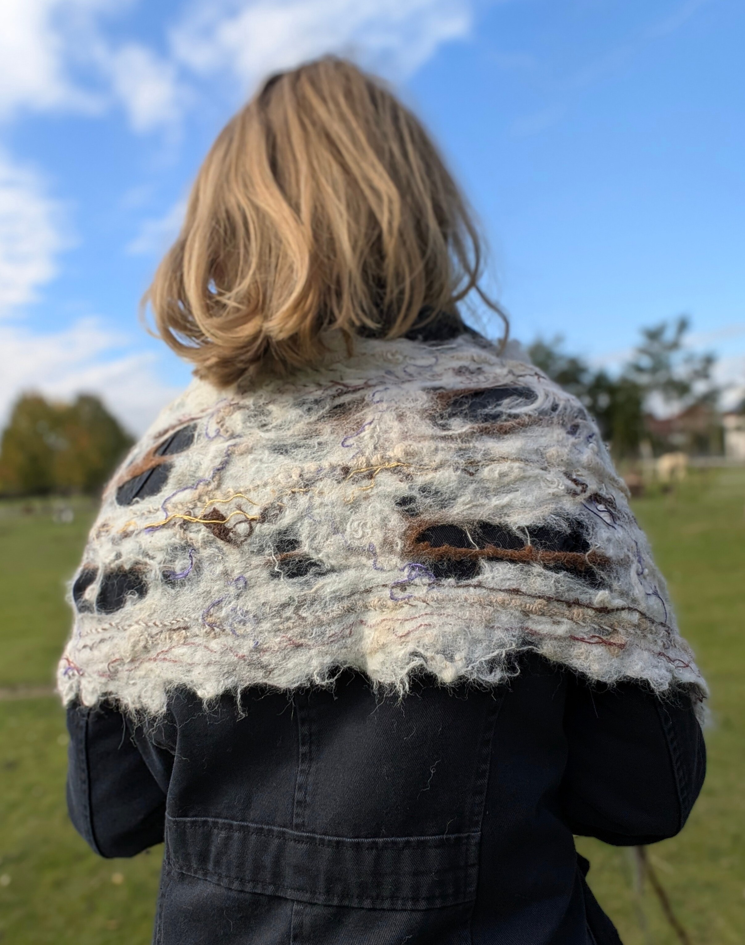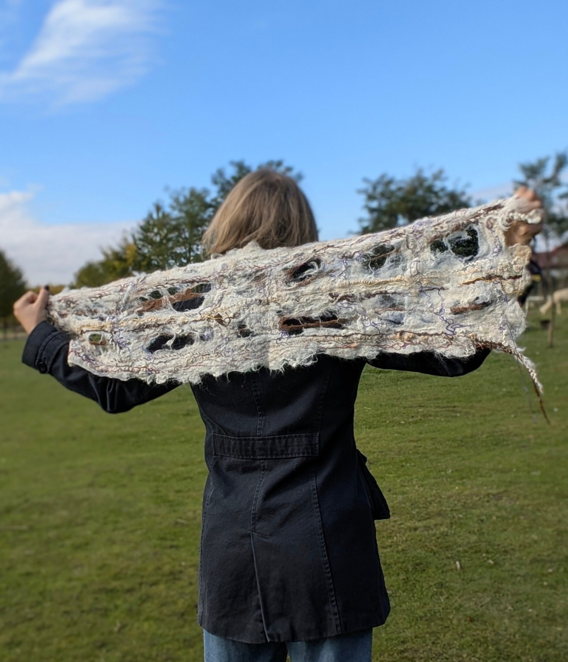 Biały szal z ozdobnymi nitkami w różnych odcieniach brązu i ozdobnymi dziurami.