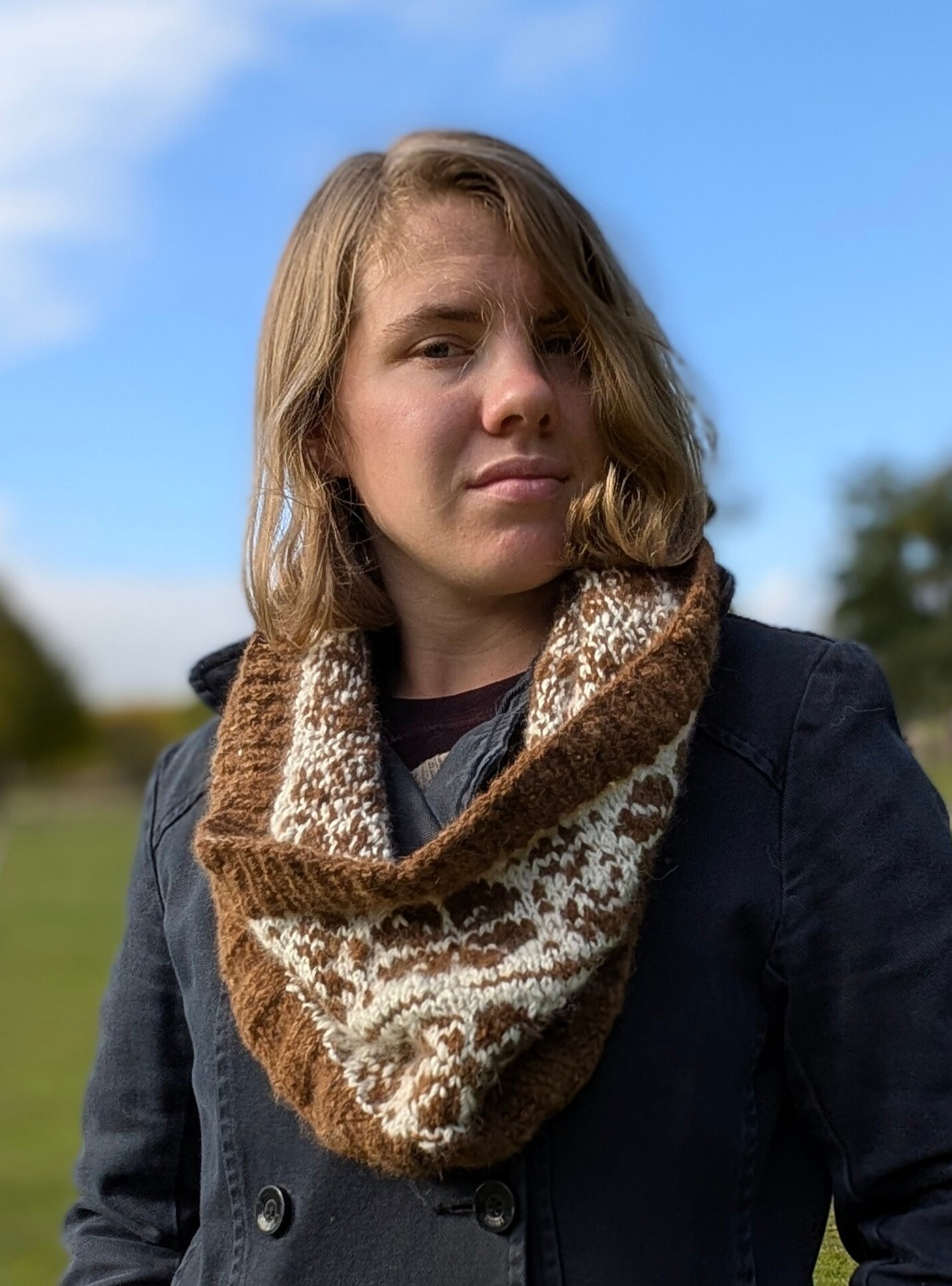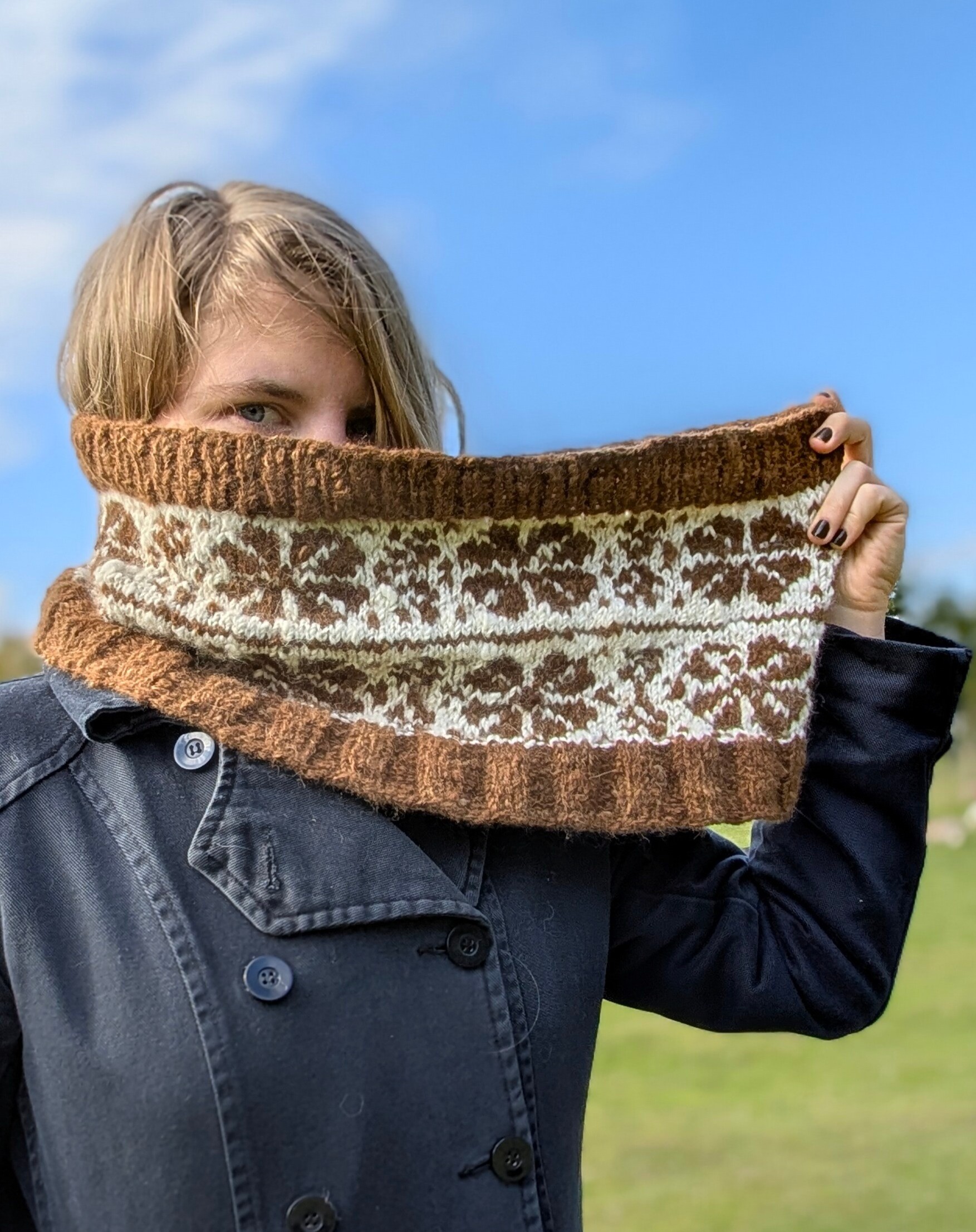 Szal typu komin z pięknym, brązowo-białym wzorem.
